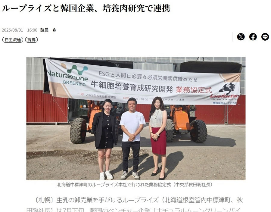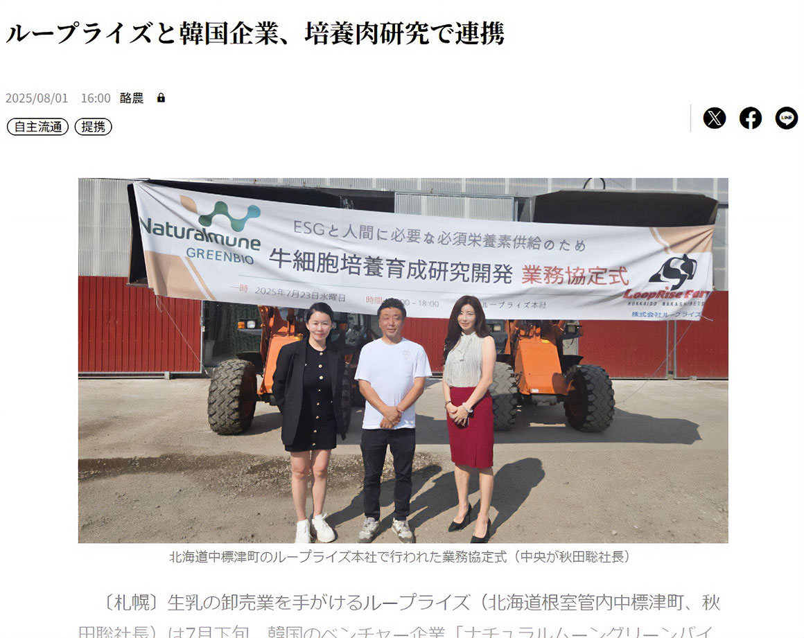 - 日刊酪農乳業速報で韓国のベンチャー企業「ナチュラルムーングリーンバイオ」との、培養肉の研究開発に関する業務提携の締結に関する記事が掲載されました。